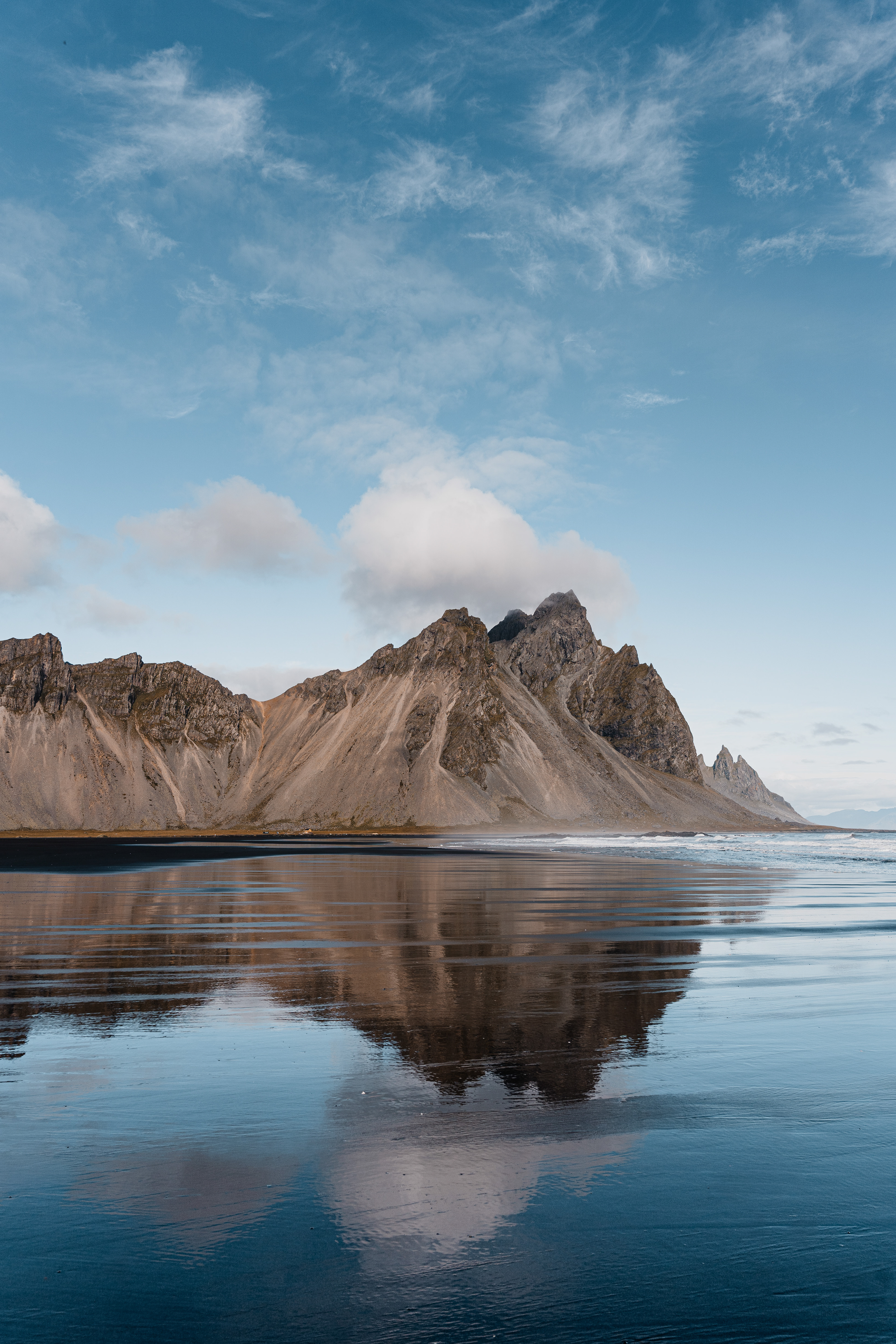 Stokksnes beach with the reflection of Vestrahorn Mountain.